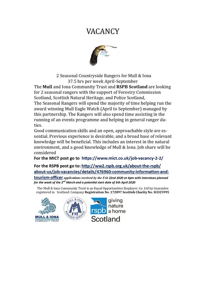 First up, there’s still time to get your application in for one of 2 seasonal ranger posts with our award-winning white-tailed sea eagle viewing project, Mull Eagle Watch: